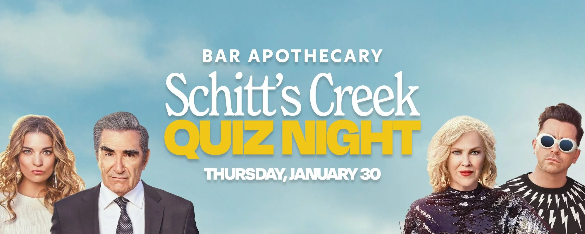 It had to be our first – join us at Bar Apothecary for a Schitt's Creek Quiz Night! Test your knowledge of the Rose family and the iconic characters for the chance to win some great prizes. Whether you're a die-hard fan or just enjoy the laughs, this quiz is for you. Plus, take advantage of our Happy Hour from 5pm-6pm before the quiz kicks off. Gather your mates, put your trivia skills to the test, and enjoy a fun night out. Book your spot in advance – it's going to be a belter!